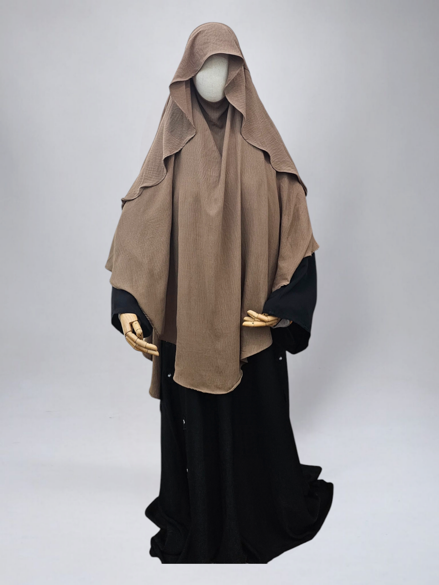 The Cape Khimar offers a versatile style with a unique cape design, giving you the option to wear it two ways. Made from excellent crinkle fabric, it provides modest coverage while allowing flexibility for daily tasks and worship. Elevate your modest style and reach new levels in covering with this truly special piece.