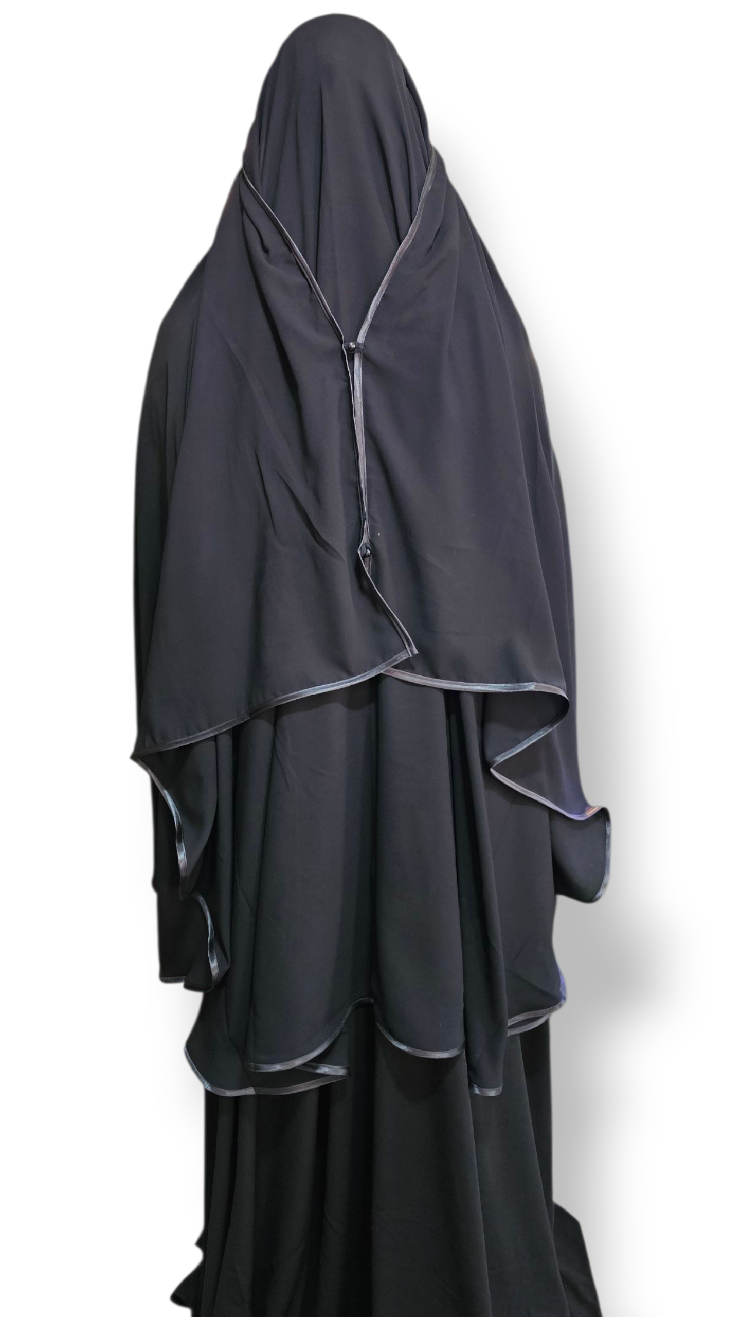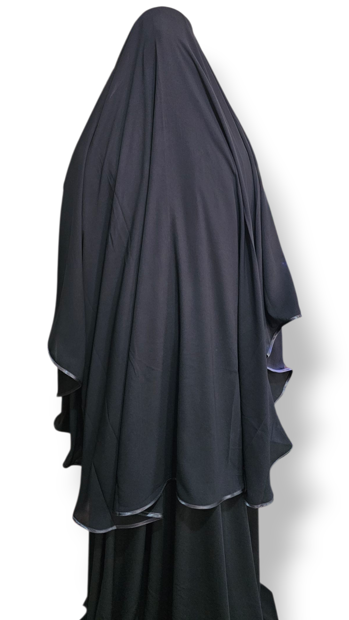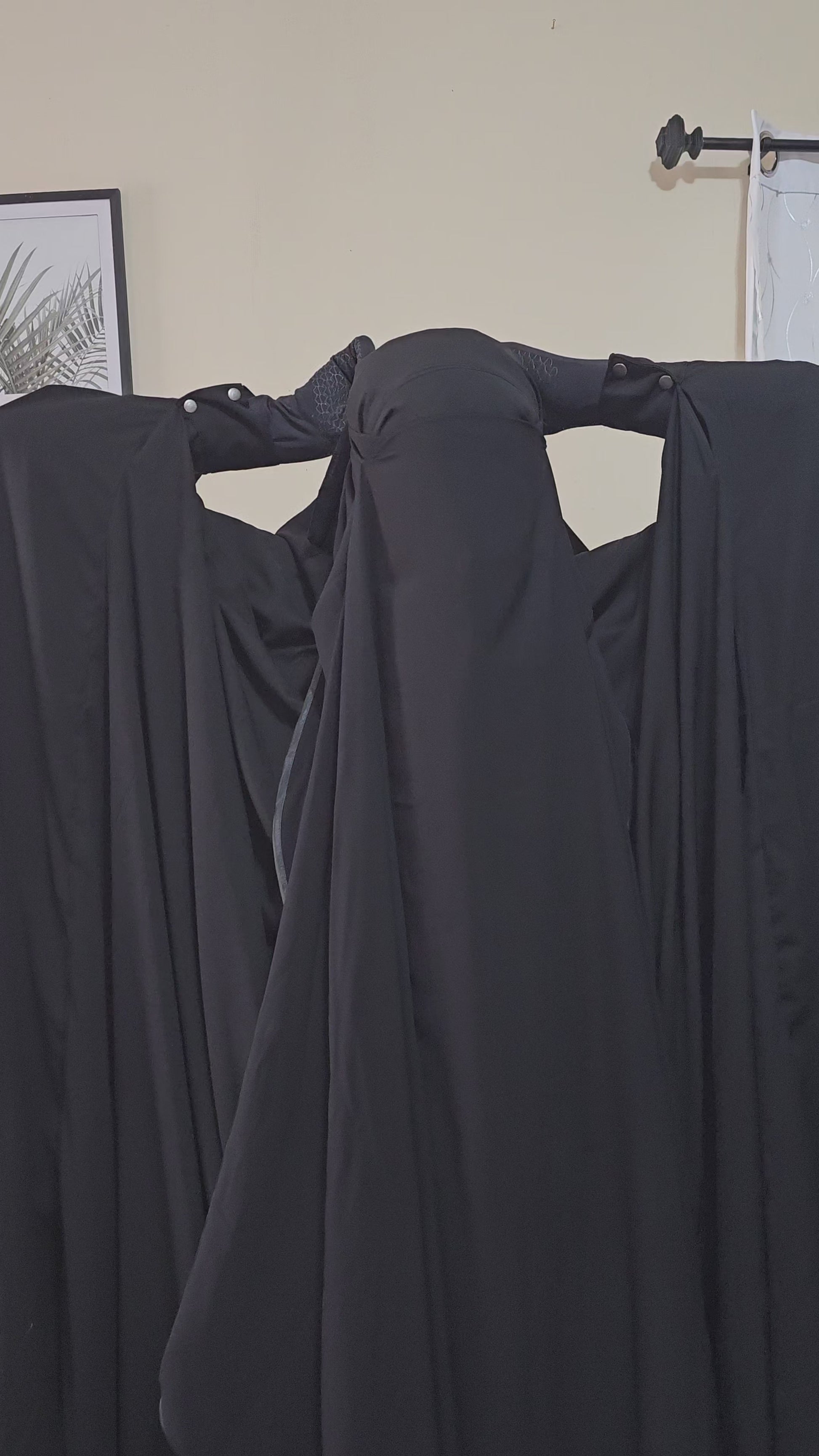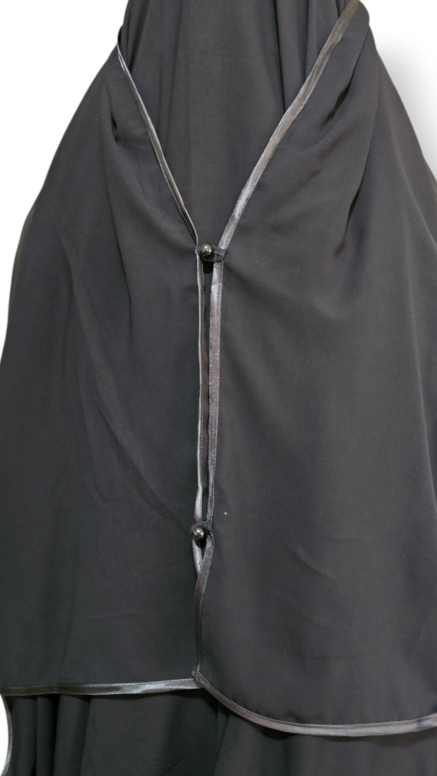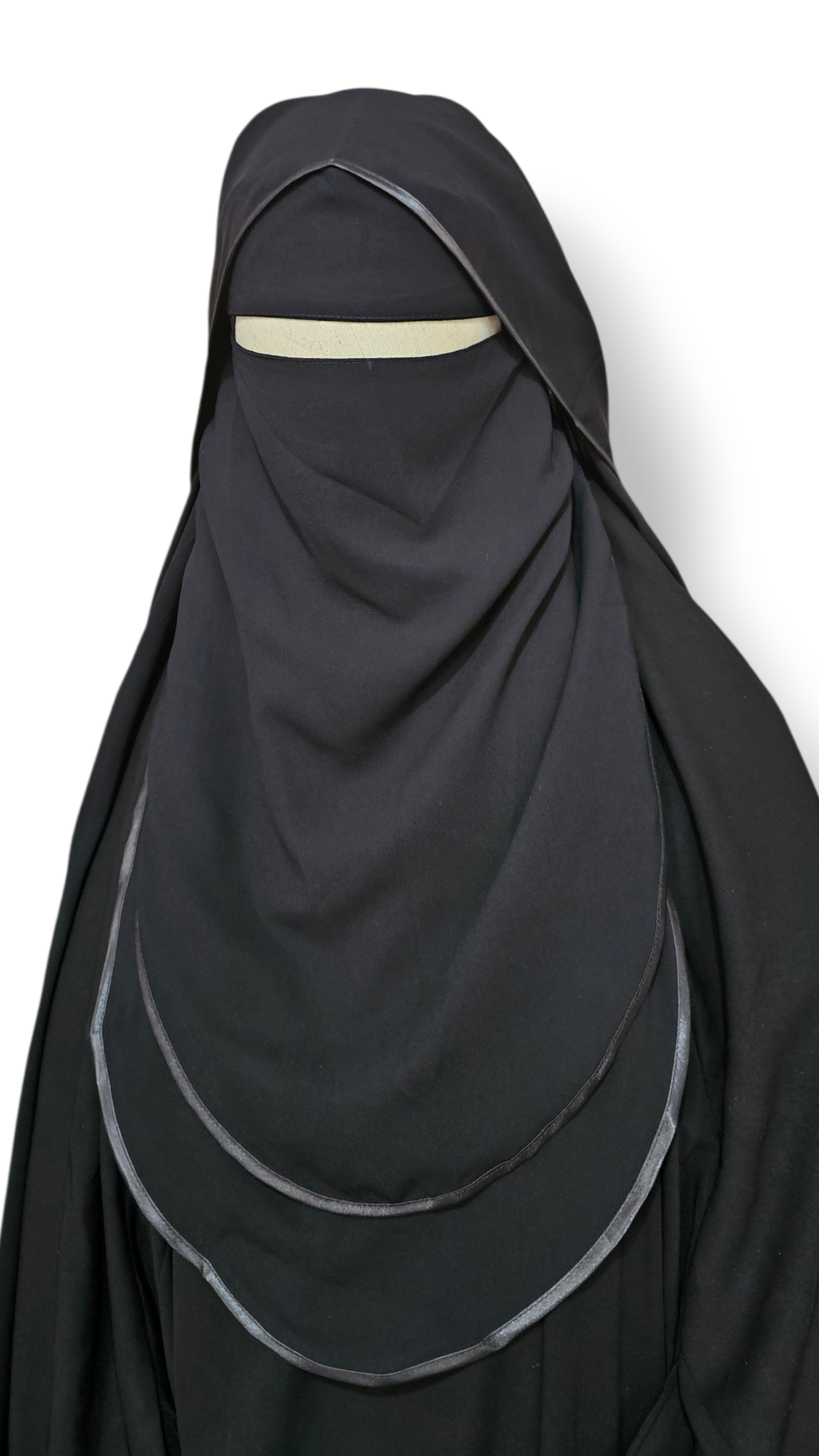 Get the cutest look with our Satin Trimmed Butterfly Niqab. Featuring black satin trim and a soft premium chiffon fabric, this niqab offers exceptional comfort and elegance. Its versatile design allows for different styling options, including a flipped back hijab style with buttons to fold in place and give a beautiful look, a halfway flip over the head with a wavy effect, full face coverage or buttoned in the front for full chest coverage.