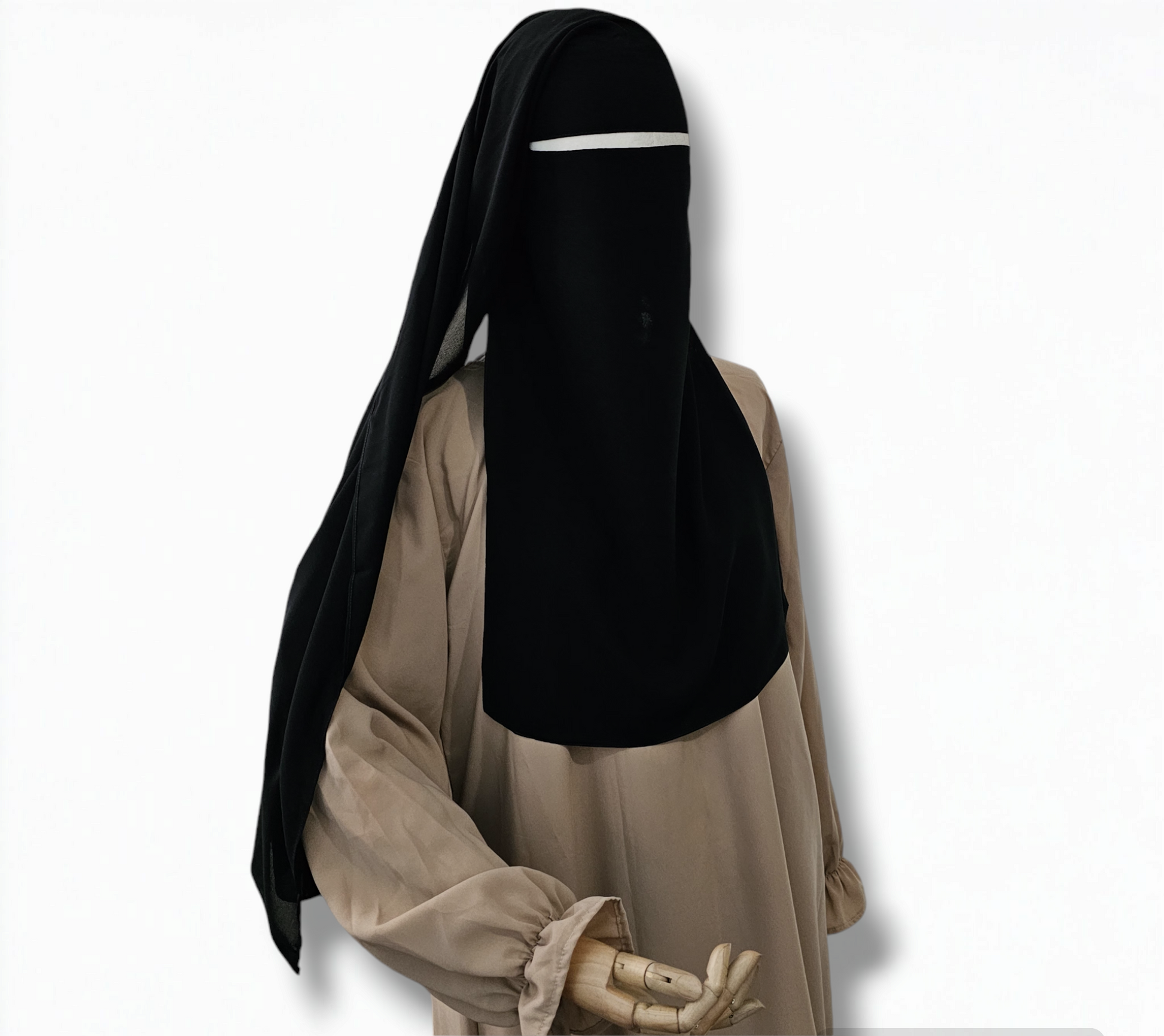 The double layer niqab is a tie back and is 20 inches long in the front so you get great coverage on the chest area. It is a soft breathable fabric and is not see through. the back gives great coverage of the shoulder area, and flows beautifully. it is made of chiffon.