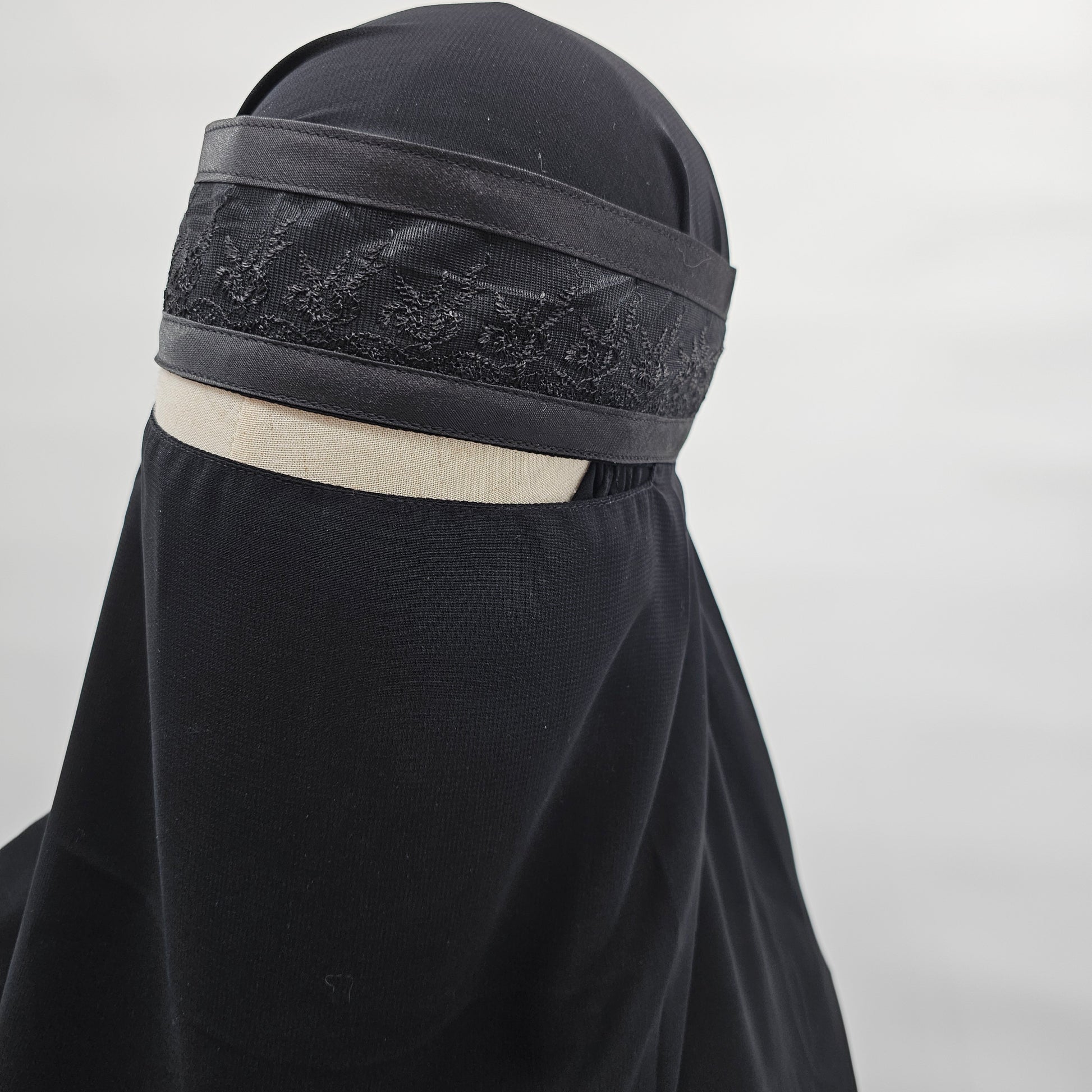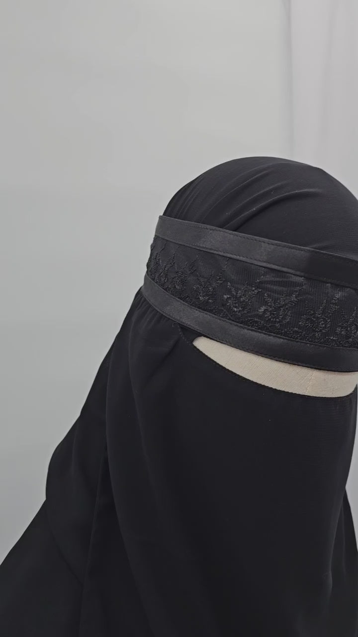 The Single layer niqab with satin trim & lace is a tie back veil that has two satin trims running along the eye part of the veil and lace in between. it is made up of wool chiffon. The front veil measures 17 inches giving good coverage. It has a wide comfortable eye space that is pinch free great for wearing glasses.