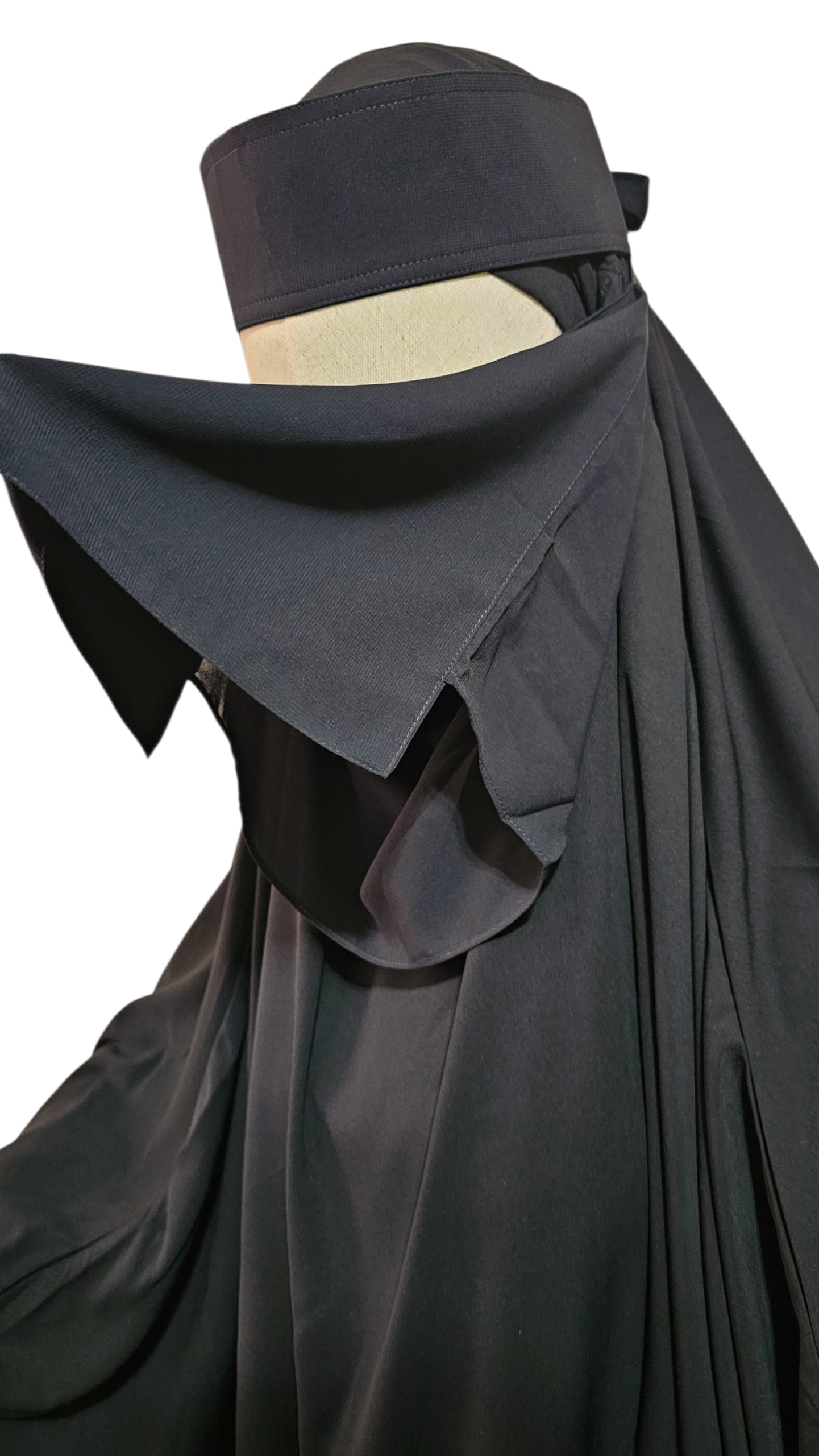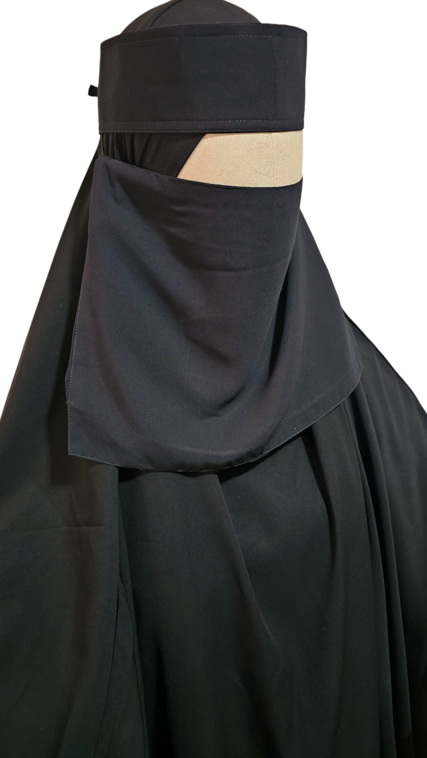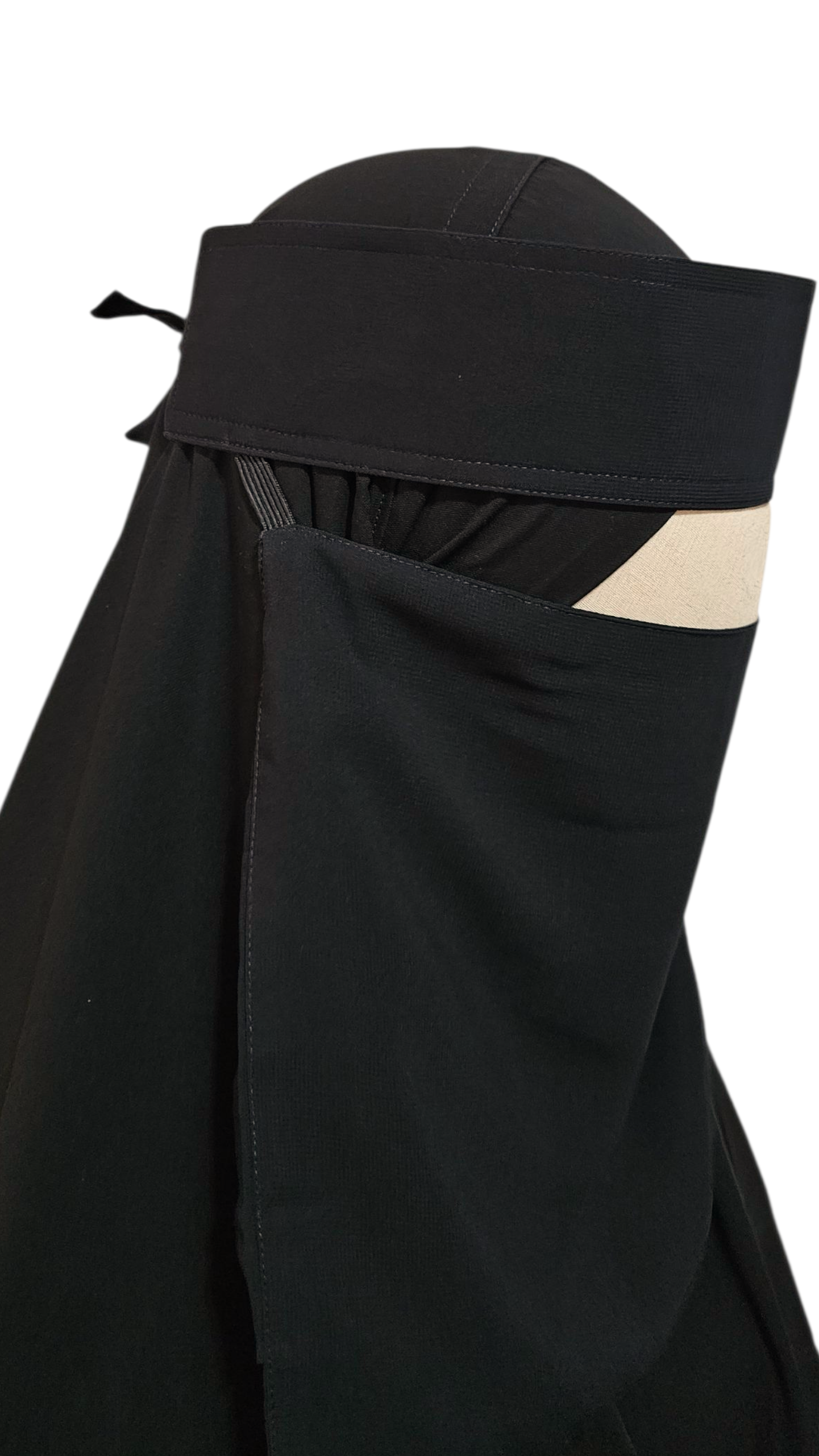 A flexible niqab that gives you comfort in your eye area with its no pinch pull down feature and comes with an eating veil in the front so you can eat comfortable in public without lifting your niqab and revealing yourself. It is also shorter so its easier to lift. The veil measures 10" long and its a tie back single layer niqab.